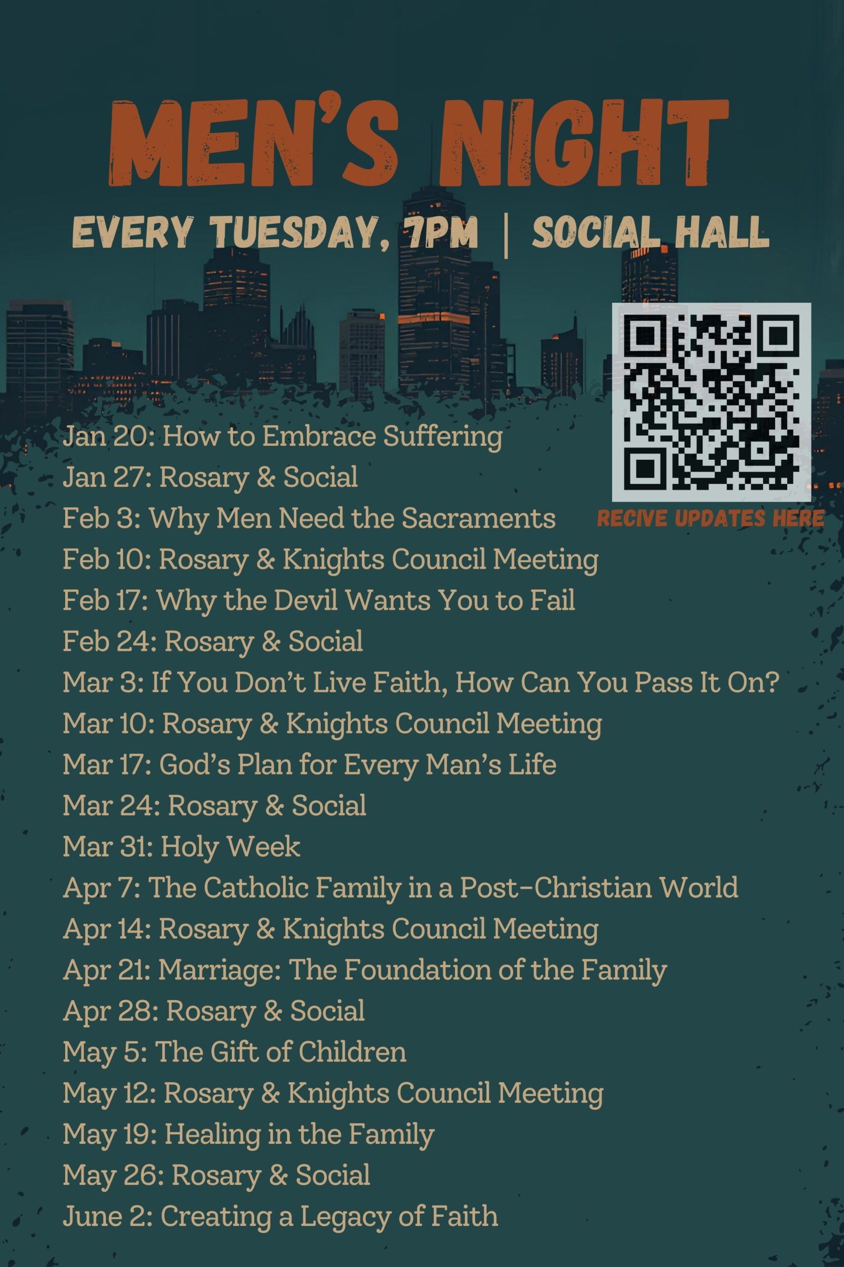 A casual space for men of the parish to gather, grow, and build fraternity—no long-term commitment required.